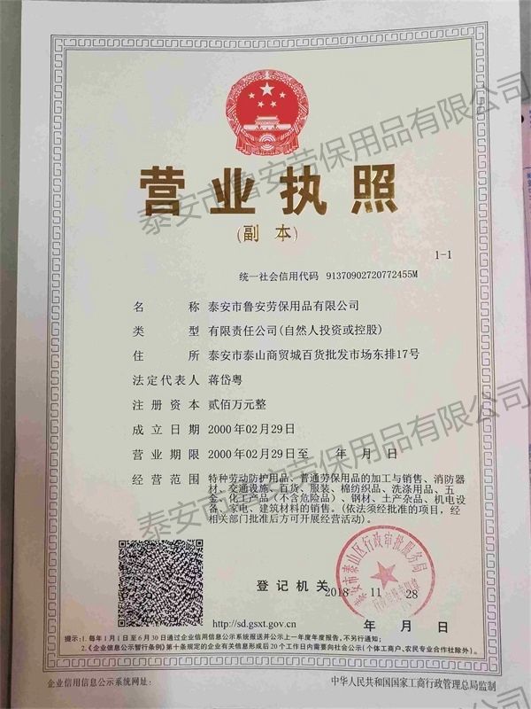 泰安市魯安勞保用品有限公司是一家從事勞保用品、勞保用品批發(fā)的企業(yè),同年,經(jīng)主管安全生產(chǎn)的有關(guān)部門批準(zhǔn)同意,經(jīng)營(yíng)銷售特種勞動(dòng)防護(hù)用品